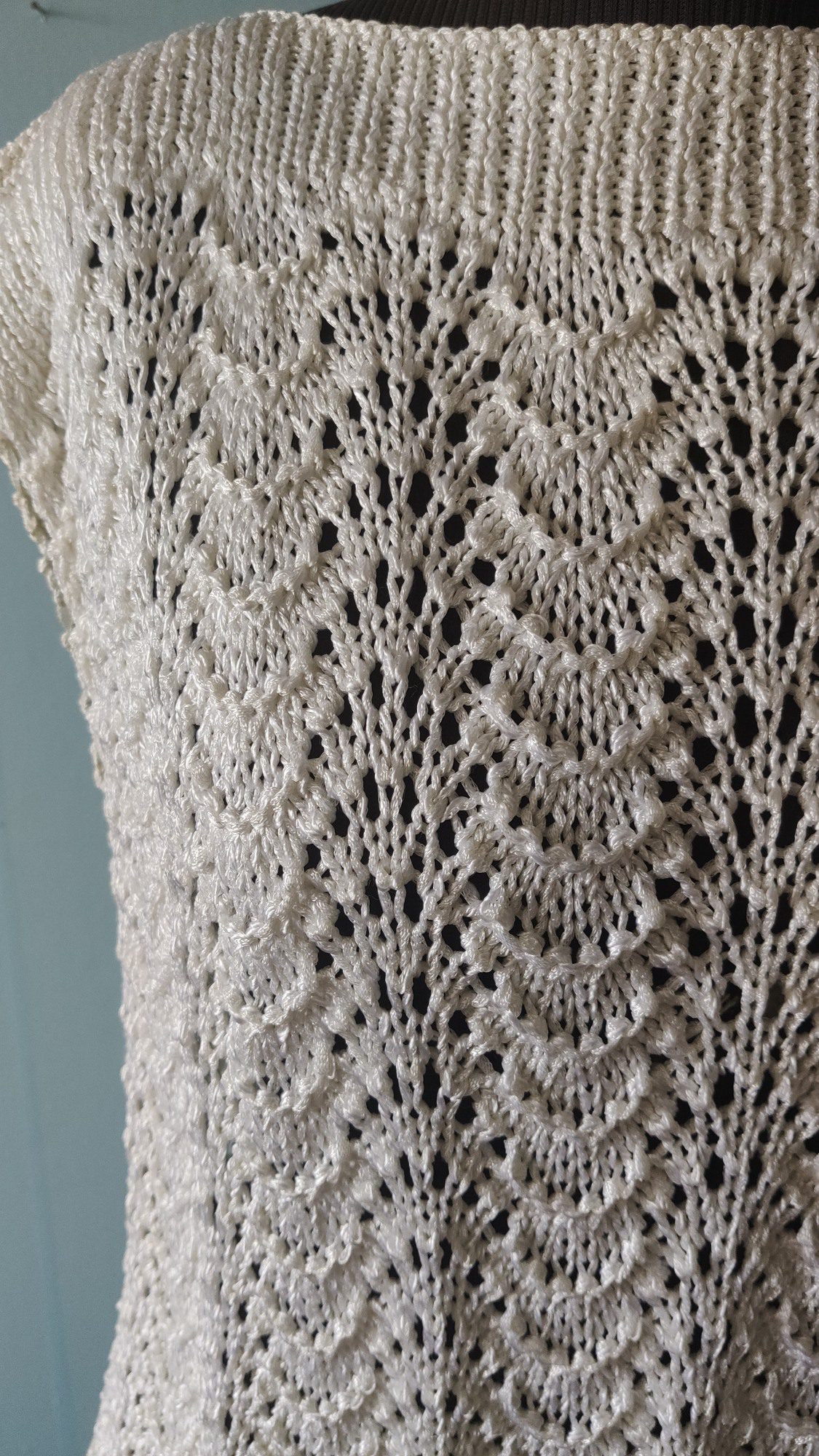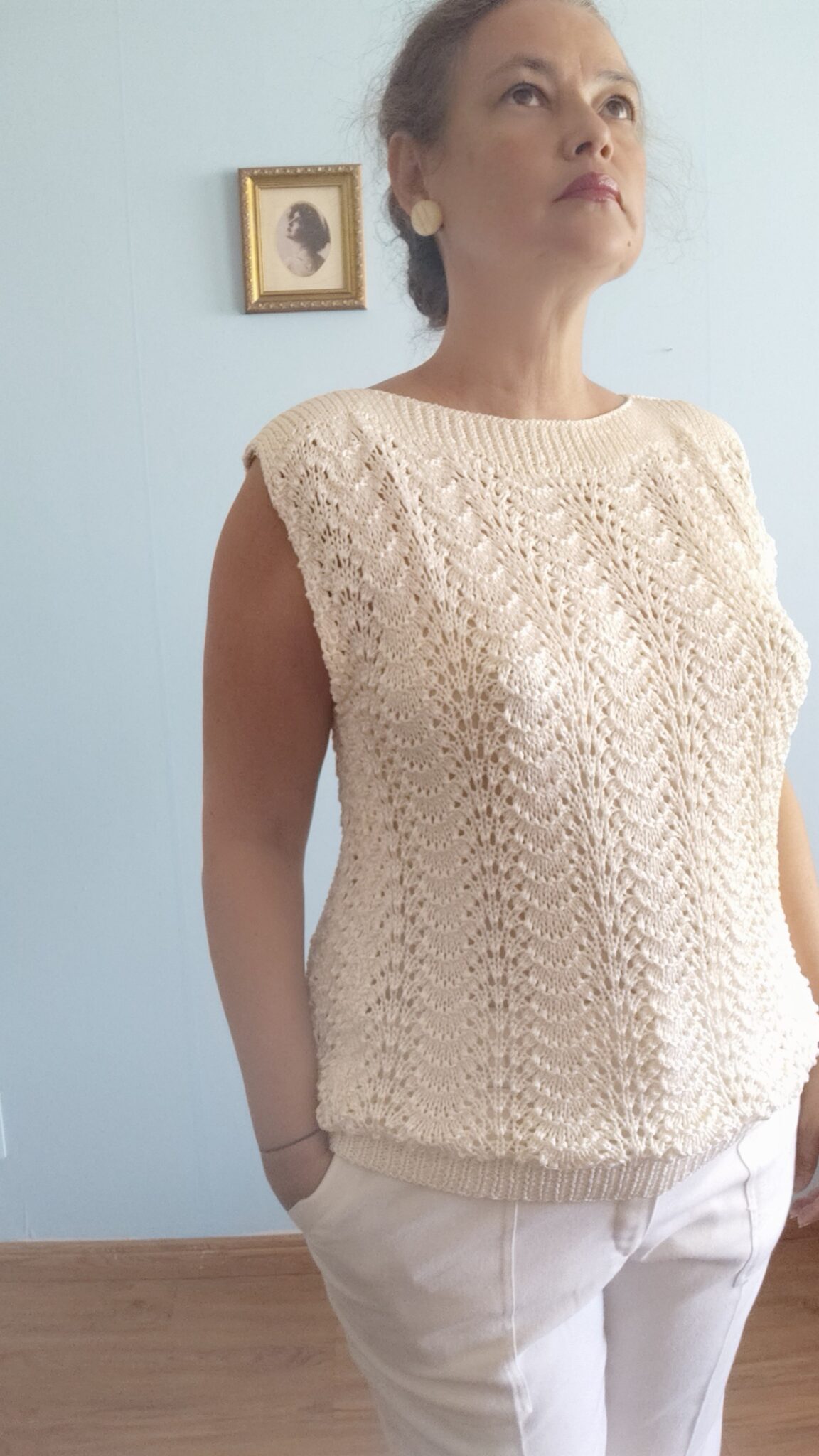 Peça confeccionada em tricô artesanal, com desenho texturizado e pontos trabalhados que revelam o tempo e o cuidado do fazer manual. A modelagem levemente estruturada e o acabamento canelado na barra reforçam o charme da década.