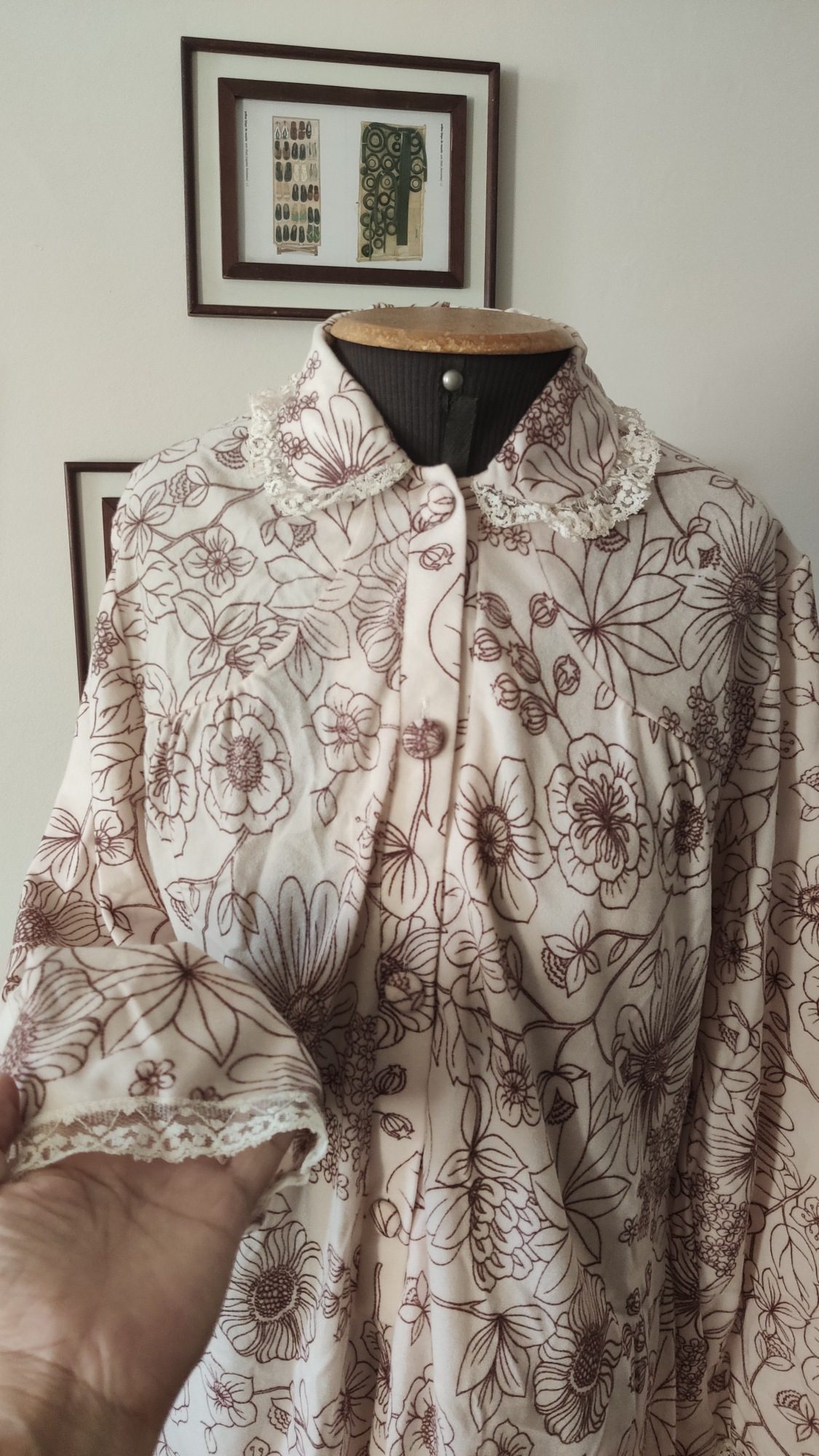 A estampa floral em tom suave se encontra com acabamentos em renda na gola e nos punhos, enquanto o abotoamento frontal com botões forrados revela um cuidado de construção cada vez mais raro.