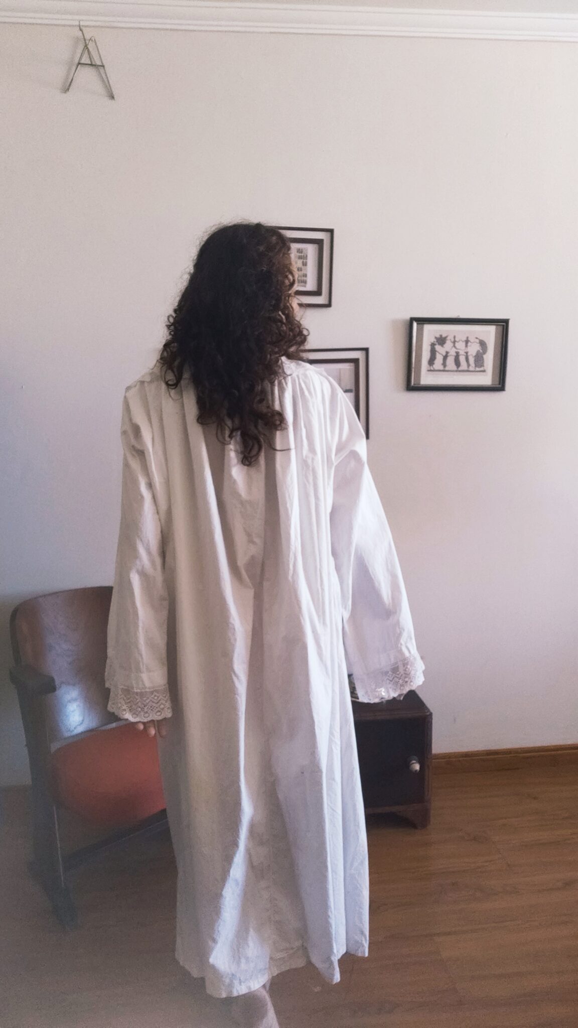 Camisola vintage original confeccionada em algodão leve, com delicadas rendas também em algodão aplicadas na gola e nos punhos. Peça ampla, de caimento fluido e mangas largas, que remete às camisolas antigas de uso doméstico e íntimo, valorizando conforto, feminilidade e tradição no vestir.
