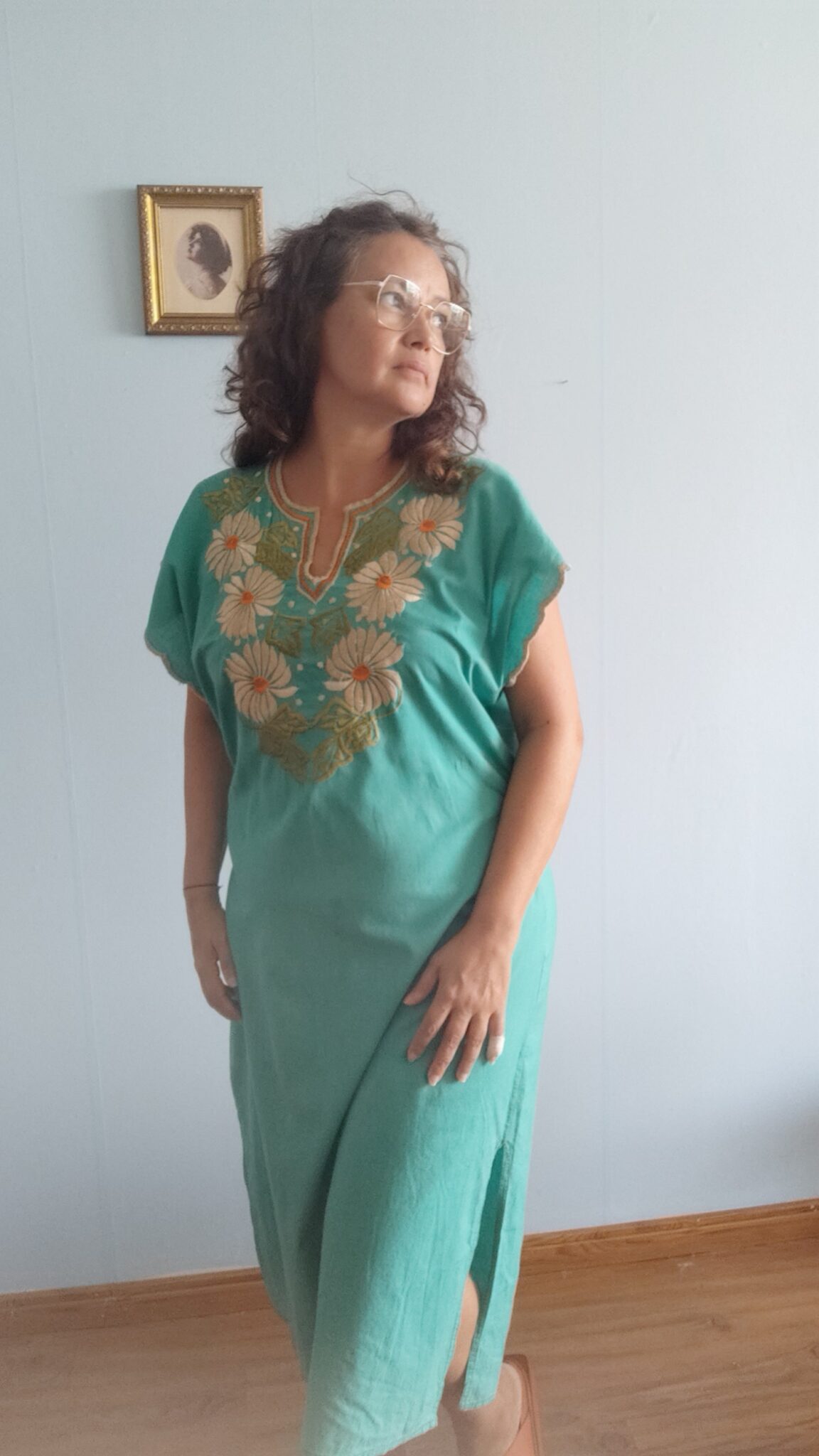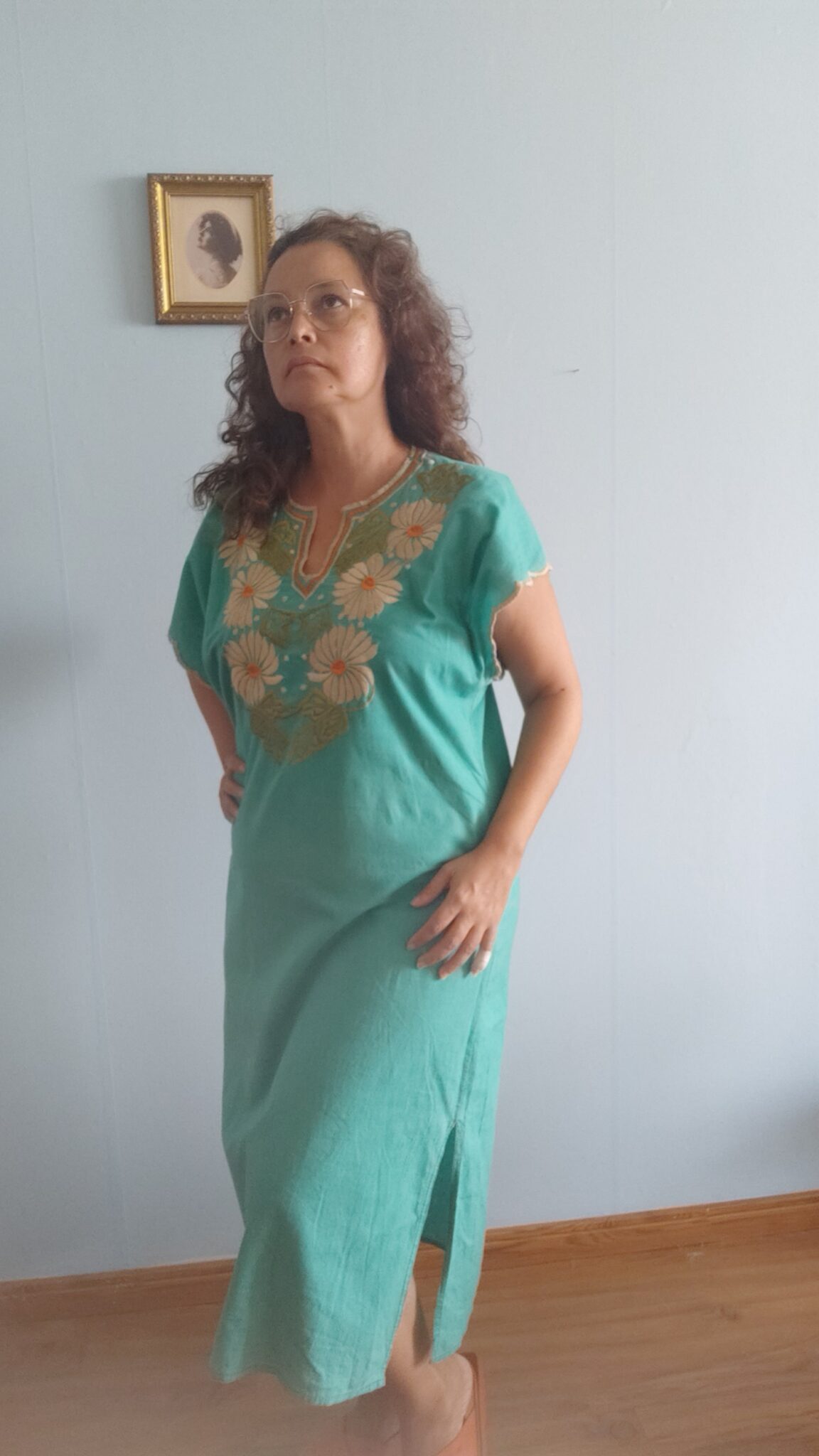 Kaftan original da década de 1970, confeccionado em algodão leve, com modelagem ampla e fluida. O bordado floral marcante, de inspiração oriental, traduz uma das estéticas mais emblemáticas dos anos 70 — quando o vestir era também gesto de liberdade.