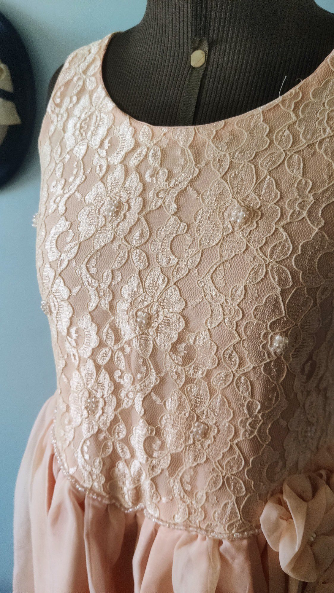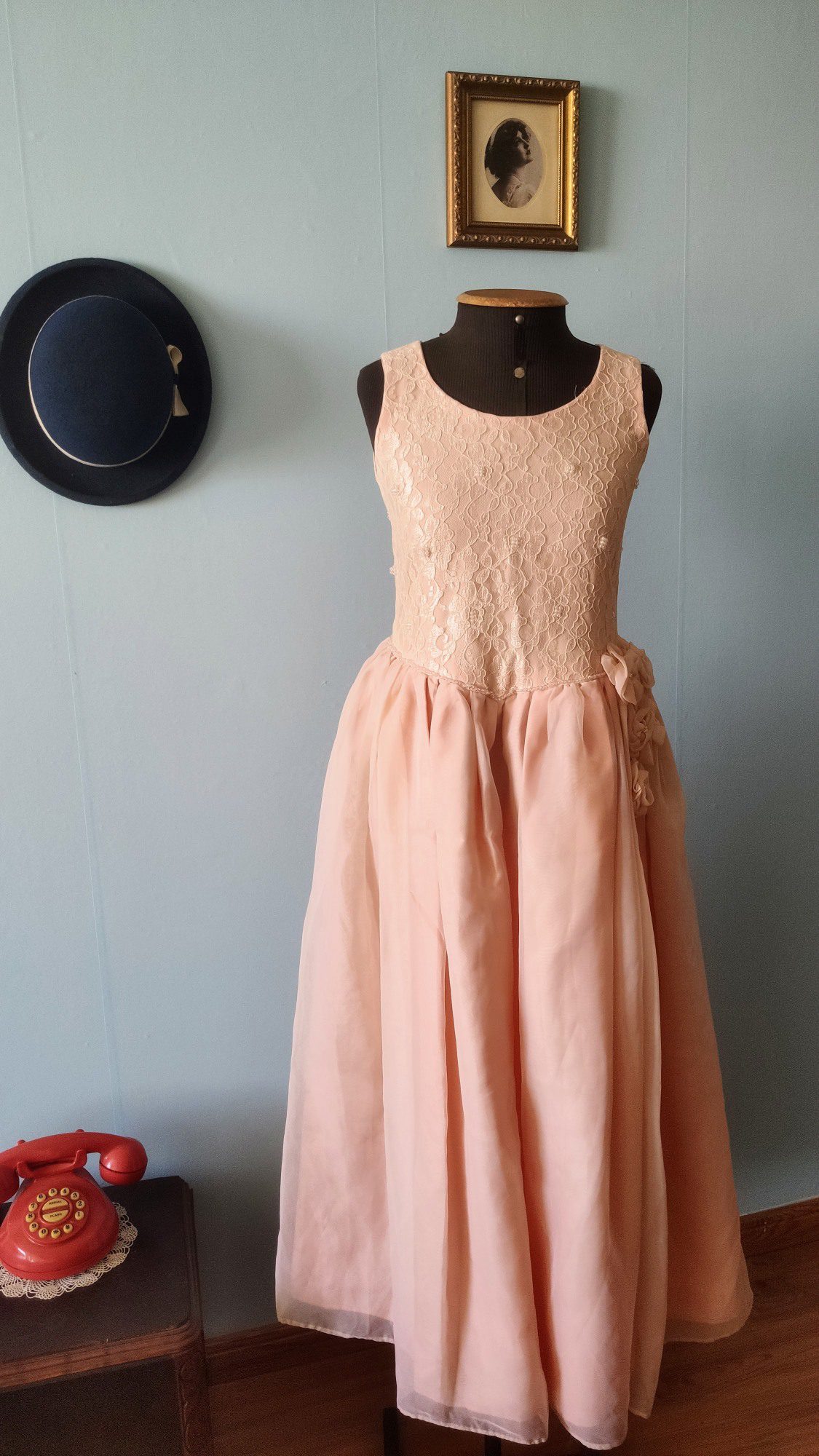 Vestido vintage em tom rosé suave, provavelmente utilizado como vestido de debutante ou festa, com estética delicada e romântica. O corpo apresenta renda trabalhada sobreposta, criando textura e feminilidade, enquanto a saia em tecido leve e fluido traz movimento e leveza ao caminhar.